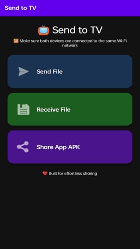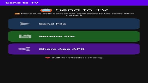 - 📂 Send & receive any file type – photos, videos, music, documents, APKs, and more., 📺 Works on Android TV & Amazon Fire TV – full D-Pad navigation and TV-friendly design., 🚀 Fast local Wi-Fi transfers – no internet needed, just local network., 🎯 Modern Material UI – clean, user-friendly, and easy to navigate., 🔄 Two-way transfer – send from phone to TV or TV to phone., ⏱ Real-time progress tracking – see exactly when your file arrives., 🛑 Cancel transfers anytime – stop sending or receiving instantly., 📦 Share your app APK – quickly send the app to other devices.