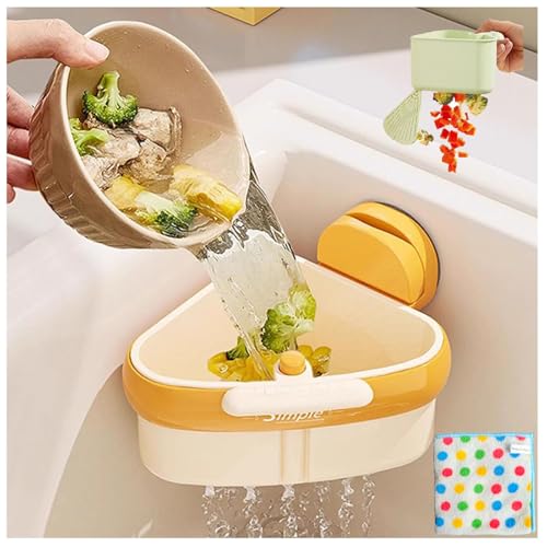 Suction Cup Sink Corner Rack 2025 New Upgraded Suction Cup Press Sink Drainer Basket Automatic Dumping Sink Strainer Basket with Drain Hole Corner Hanging Triangle Storage Rack (Yellow)