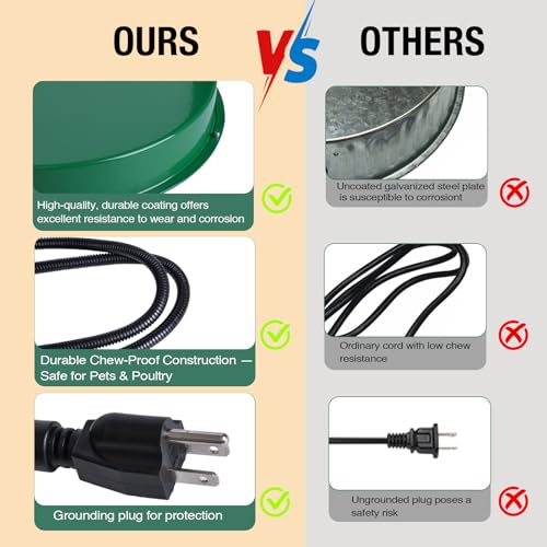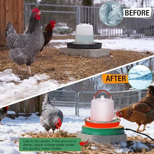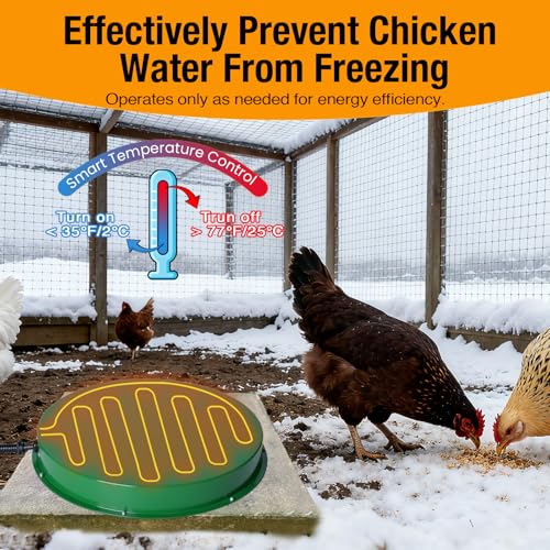 - Efficient 125W Winter Heating – 125W thermostatic poultry water heater keeps water from freezing down to -20°F, ensuring chickens and small flocks always have fresh water in winter, Smart Thermostat Control – Built-in thermostat automatically turns on below 35°F and off above 77°F, preventing overheating, saving energy, and keeping water at a safe temperature, Fits Metal & Plastic Waterers – 12.4in (31.4 cm) heated base works with 1–5 gallon metal or plastic poultry waterers, upgraded with denser heating coils for faster, consistent thawing, Durable & Safe Design – Heavy-duty galvanized steel with anti-rust coating, plus a 6.6FT chew-proof cord and grounded plug, ensures long-lasting, safe use for coops and small animals, Multi-Purpose Freeze Protection – Ideal for chickens, ducks, and geese in coops, pens, and covered outdoor areas
