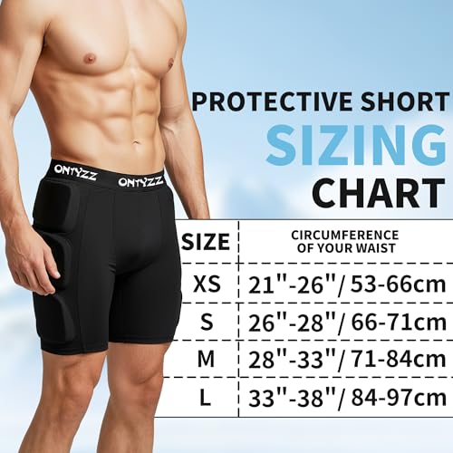 - Limitless Mobility, Fearless Protection: Engineered for high-impact sports, our ONTYZZ Protective Shorts provide rugged yet hidden armor for your hips, thighs, sit bones, and tailbone, moving seamlessly with your body. Whether you're snowboarding, skateboarding, cycling, or mountain biking, stay protected without sacrificing agility., Advanced Shock Absorption: Featuring 16mm waterproof high-density EVA foam padding, our shorts deliver maximum impact resistance while remaining lightweight. Strategically placed cushioning absorbs shocks from falls, bumps, and crashes, keeping you safe during intense action., Breathable & Skin-Friendly Fabric: Crafted from 77% nylon + 23% spandex butterfly mesh, our shorts offer superior stretch with size-specific ergonomics: XS: 21"-26" (53-66cm) ; S: 26"-28" (66-71cm) ; M: 28"-33" (71-84cm) ; L: 33"-38" (84-97cm). The ventilated design keeps skin cool and dry, preventing irritation even during long sessions. (Pro Tip: For optimal protection, choose your size based on waist measurement while wearing your usual sports base layer.), Durable Yet Flexible Fit: Unlike bulky traditional padded shorts, ONTYZZ Protective padded shorts design ensures flexibility without discomfort. The EVA pads in the protective shorts are removable. The custom-fit waistband provides a secure yet non-restrictive feel, while the machine-washable construction guarantees long-lasting durability., All-Day Comfort for Any Adventure: Designed to be worn underneath your gear, these shorts combine high-grade nylon, spandex, and vent mesh for a relaxed, breathable fit. Perfect for extreme sports and outdoor training in all sizes from XS to L - with strategically scaled protection zones that move with your body.