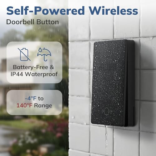 - 【Effortless Wireless Setup】No wiring, no hassle! This wireless doorbell installs in seconds—just plug in the receiver and mount the weatherproof button at your desired location. Ideal for homes, classrooms, apartments, and offices., 【Clear & Loud Ringing】Never miss a visitor again! This doorbell delivers a loud 100dB chime with 4 adjustable volume levels and offers 38 tunes—plus a built-in memory function to record your own songs. Perfect for classroom settings or noisy households., 【Battery-Free & Easy Installation】The self-powered doorbell requires no batteries—just press the button to generate power. Installs in seconds with included screws or strong adhesive tape. The receiver is user-friendly for all ages, from kids to seniors., 【150m/500ft Long Range & Strong Wall Penetration】 Powerful signal reaches up to 500ft in open areas and penetrates 3-layer walls, making it ideal for front doors, back doors, gates, or as a classroom doorbell for teachers., 【IP44 Weatherproof & All-Season Durability】Built for Canadian weather, the wireless doorbell button is IP44 waterproof and withstands extreme temperatures (-20°C to 60°C / -4°F to 140°F). Rain, snow, or sun—it stays durable year-round.