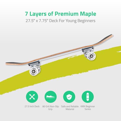 - KMX 27.5" Beginner Skateboard - A sturdy and reliable 27.5x7.75" 7-layer hard maple skateboard deck features polyurethane wheels(95A)and just the right concave surface for beginners., Durable Build - 5.0" aluminum alloy trucks with high rebound polyurethane bushings(95A)for excellent performance and durability, a skateboard designed for cruising and simple trick training., Premium Bearings - KMX ABEC-9 precision chrome bearings are smooth and fast, equipped with rubber dust covers for easy cleaning., Smooth & Easy to Control - Pushing and gliding, the skateboard will provide excellent rolling and grip on a range of different surfaces and speeds. The plate's grip tape and moderate concave surface help the rider control., Super Cool Skateboard Gift - KMX beginner classic skateboard is fully assembled and comes with a T-tool. Its high quality and unique design make it one of the best skateboard gift choices. Surprise someone special with this skateboard on a birthday, Christmas, holiday or any special occasion!