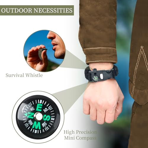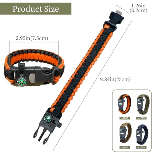 - 5-in-1 Wilderness Survival Kit (Per Bracelet):Contains- Fire starter (ferro rod + scraper), compass, loud rescue whistle, 115" paracord(290cm), and rope cutter. Ready for fire-making, shelter-building, or emergency signaling., Universal Carry Solutions:One-size design – securely wraps around backpacks, belts, or gear straps if not worn on wrists. Tools stay accessible during critical moments., Group Safety Essentials:4 bracelets per set – perfect for equipping families, hiking teams, or scout groups. Ideal for bug-out bags, glove compartments, and emergency kits., Focused Survival Priorities:Prevent hypothermia with fire starters that work when wet. Use the compass to avoid getting lost. Loud whistle alerts rescuers from afar., No-Nonsense Durability:Weather-tested paracord with rust-resistant tools. Compact embedded components won’t snag on gear.