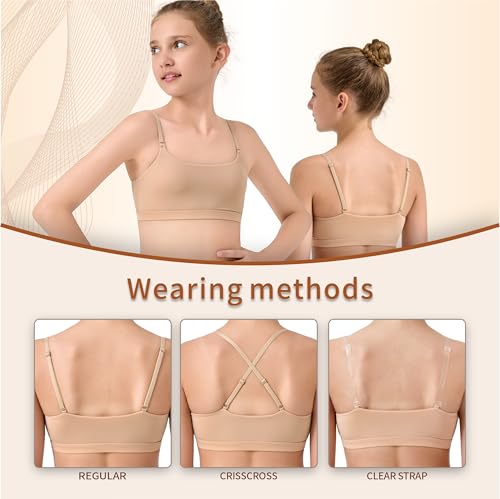- Soft to Wear:Including 82%nylon and 18%Spandex, our beige seamless dance bra provide a soft , breathable feel that ensure comfortable and freedom better to protect girl bust during all the dance activities !, Adjustable and replacement Straps: Girl dance bra provide your teenage girls with 1 pairs transparent straps and 1 pair straps same color as the bra to adjust and change straps to meet your difference need, Enough Privacy: Dance sport bra with silicone pads can keep girls secure under her dance clothes, and the clear straps are invisible and cannot be seen while on stage., Size Optional Guide:We have three size for the girl dance sport bra for teen girl choose S M L , Size S fit for girl age 7-10Years ,Weight (49.6lb-70.9lb);Size M fit for age 10-14Years Weight(68.1-92.4lb); Size L suit for age over 14-16years,Weight(85.2-127.2lb);Pls according to your kids age and height choose the right size., Versatile Design: Ballet top bra under is perfect for various style for dance ballet gymnastic leotard sports and daily life to wear.