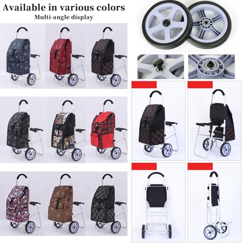 - 【Aluminum Alloy Frame, 100kg(220lbs) Capacity】 This foldable shopping cart is built with a lightweight yet sturdy aluminum alloy frame and a reinforced 32mm thick main tube. Strong load capacity up to 220lbs makes it perfect for carrying groceries, bottled water, or heavy items. Durable design ensures long-term use for daily shopping and outdoor needs., 【Seat Included, Rest Anytime】 folding shopping cart with seat with a convenient seat, the shopping cart uses double-layer Oxford cloth for extra support. The widened seat provides stability and comfort, making it safe for seniors to sit and rest while shopping, at the park, or during outdoor events., 【Foldable Design, Space-Saving Storage】 Easily foldable without tools, this grocery cart can be stored compactly in the entryway, closet, or car trunk. stair climbing shopping cart Lightweight structure makes it easy to carry, ideal for everyday shopping, travel, and camping., 【Silent Wheels, Smooth Rolling】 Upgraded wear-resistant rubber wheels with dual-bearing structure ensure smooth movement over bumps, curbs, and cobblestone streets. Silent design reduces noise, making it ideal for early morning or nighttime use. Stair climbing wheels provide easy transport for apartments, houses, and outdoor terrains., 【Large Capacity & Multi-Pocket Storage】heavy duty shopping cart The waterproof Oxford cloth bag offers generous storage space, detachable and washable for convenience. Multiple pockets allow easy organization for wallet, phone, and accessories. Secure and U-lock straps keep items steady—ideal for grocery shopping, parcel delivery, laundry, travel, and outdoor activities.