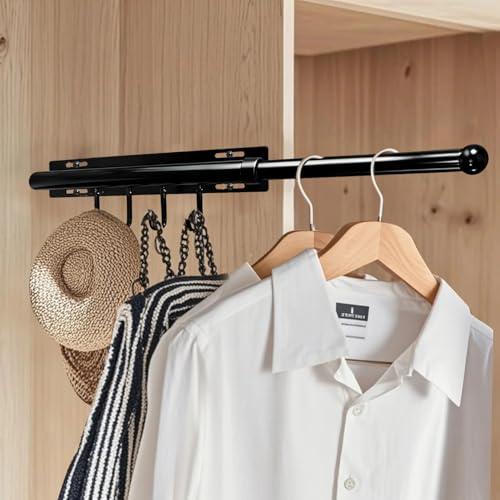 - 【Maximizing Your Space 】This 12 inch Valet Rod maximizes your wardrobe space and efficiency.(Please not stretch completely to avoid the psssibility of can't be reset!) The Closet Rod can be easily pulled out and retracted when not in use, and four metal hooks can hang belts, bras, ties, and hats., 【Durable Structure&Strong Load Capacity】 This Valet Rod for Closet Pullout is made of metal material to ensure durability and stability. The sturdy structure can support a weight of up to 20 pounds, making it durable and suitable for hanging various types of clothes., 【Easy Installation】 Install it on the right side of the wardrobe, which is a wardrobe pole that can be pulled out to the right,The closed rods for hanging clothes can be installed in just one minute, and we have equipped the product with a complete set of installation accessories that can be installed wherever you need them., 【Upgraded Design】Our closed extender hanging rod features an innovative design with 4 sturdy metal hooks that are integrated with the closed valence rod slide out. You don't need to install the hooks anymore, saving you more time installing the closed pole and providing a great solution to save space., 【Versatile use】This scalable clothes hook pole can be installed in wardrobes, laundry rooms, bathrooms, and anywhere you want to install it. It can be used to hang clothes, dishcloths, kitchenware, etc., ensuring a durable and reliable storage solution.