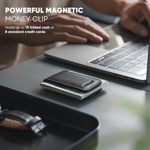 VULKIT Magnetic Money Clip Leather Money Holder Minimalist Design Holds Up to 15 Cash, Top Grain Leather-Black, Slim