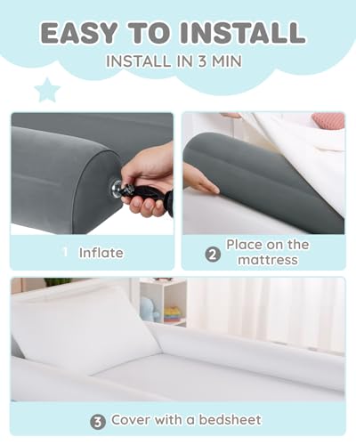 - Meets All Safety Certified: Made of durable and hypoallergenic materials, Lilian&Gema bed bumper for toddler are completely free of phthalates, BPA, and lead, and meet all required ASTM, CSPA, CFR, CPSIA, and CPSC certifications, no more worry about harming your child's health, Effortless Setup: These inflatable bed rails for toddlers use a special valve that makes inflating in seconds without a pump. Placing bed rails under the sheet and fold the edge of the sheet under the mattress to securely hold it in place all night, Non-Slip StabiIity: Your child's safety is our priority. The bed rails for toddler are crafted from non-slip velour surface, combined with an extension piece ensures exceptional stability. It effectively preventing accidental rolling or falling, offering peace of mind and making it a top choice for parents, Fit for All Beds: Designed to be versatile, our blow up bed rail (52"L x 6.9"W x 7"H) fit for any toddler, twin, full, queen, or king-size beds. Additionally, this bed guard rail is designed to work with any size sheets, ensuring a seamless and secure setup every time, Ideal for travel: Our baby bed rail guard can be quickly deflated to a compact, space-saving size. This portable toddler bed rails is perfect for travel and also ideal for home use, providing additional safety and convenience