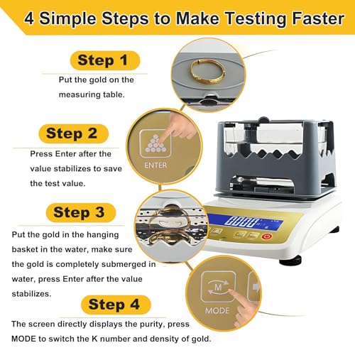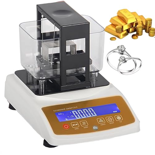 - 【Accurate Purity Measurement】This gold tester utilizes advanced density/gravimetric analysis technology to accurately test the purity of gold, silver, platinum, and palladium, Measurement accuracy up to 0.0001g/cm³, reliably assessing metal composition., 【High Accuracy and Stability】This electronic gold tester integrates a high-precision load cell with a weighing accuracy of up to 0.001g, low-temperature drift technology, and overload protection, ensuring stable and consistent performance., 【Non-destructive Testing】The precious metal density meter kit ensures safe and non-destructive analysis, ensuring your gold, silver, and platinum retain their original value and integrity during testing., 【Clear LCD Display】This digital electronic gold purity tester displays density, weight, purity, and karat value in real time, making results quick and easy to read., 【Portable and Versatile】This gold tester includes a rechargeable battery for long-term standby time, making it convenient to use anytime, anywhere. It is ideal for jewelers, pawn shops, laboratories, and dealers testing a variety of metals.