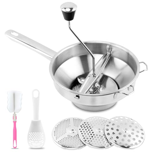 - 【Durable Stainless Steel Design】Made from durable stainless steel, this food mill features an elegant design that is easy to clean, making it a practical and stylish addition to your kitchen tools., 【3 Grinding Discs】 3 grinding discs (coarse, medium, fine) can be used for different food needs, easily turning soft food into silky puree, which can be used to make ketchup, mashed potatoes, jam, applesauce, baby food, etc., 【With Slotted Spoon】The slotted spoon is a multifunctional kitchen helper and with multiple holes and raised points, can be used for filtering, garlic/ginger grinding, potato mashing, stirring, serving rice and so on., 【Easy To Use】The mill has a large blade that can easily process more food, improve efficiency, save time, and the ergonomic handle with silicone is comfortable to hold and non-slip, allows you to turn easily. The double hook design of the food mill can fix it firmly on the mixing bowl., 【Package Content】You will receive 1pc stainless steel food mill, 3pcs milling discs with different sizes of pores, 1pc white slotted spoon and 1pc pink sponge brush. Practical set to meet your different needs. The sponge brush can help to easily clean the food mill.