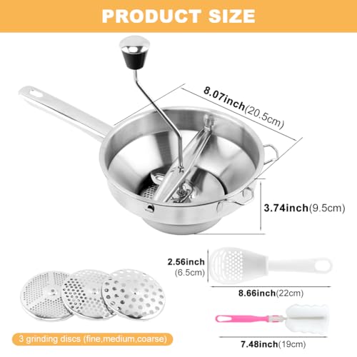 Food Mills with 3 Milling Discs, Ergonomic Stainless Steel Rotary Food Mill with Hand Crank for Tomato Sauce, Applesauce, Puree, Mashed Potatoes, Jams(8 inchs)