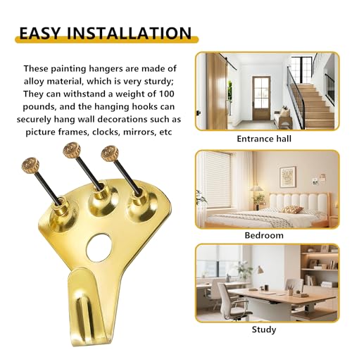 - Heavy Duty Picture Hanger:These picture hangers are made of alloy material,very strong;they can bear 100 pounds, and picture hanging hooks can firmly hang photo frames, clocks, mirrors and other wall decorations, Little Damage to The Wall:Apalie picture hook nails are very small, leaving only small nail holes on the wall when used, which is easy to cover and repair when moving the picture hook, and the damage to the wall is very small, Easy to Use: Just knock in the nail with a hammer, and the photo frame hook can be fixed on the wall. These picture hangers are packed in a plastic box that is easy to store and can be detached from the wall for reuse, Widely Used:The heavy-duty hook is suitable for home, office or any place where it needs to be hung, and it can easily hang photo frames, mirrors, clocks and watches, etc. Note: This picture hook can be used for wooden walls and drywall, but not for ceramic walls and concrete walls!, Packing:12 PCS picture hangers and 36 PCS steel nails are put in a transparent box
