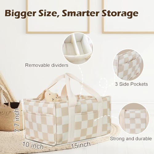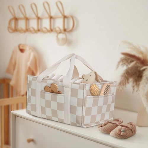 - Baby Diaper Caddy Organizer – Keep all newborn essentials in one place with this stylish baby diaper caddy. Perfect for diapers, wipes, creams, bottles, toys, and clothes., Large Capacity with Removable Dividers – Our diaper caddy organizer features spacious compartments and removable dividers, making it easy to customize storage for any diaper station., Portable Baby Caddy Organizer – Lightweight with sturdy handles, this storage basket moves easily from nursery to living room or car, ensuring quick diaper changes anywhere., Stylish Neutral Checkered Design – Unique beige and white checkered fabric adds a modern touch to your nursery décor. A unisex baby caddy organizer perfect for both boys and girls., Baby Shower Gift & Registry Must-Have – More than just a diaper station organizer, this baby diaper caddy doubles as a stylish storage basket or toy bin, making it a thoughtful baby shower gift.