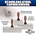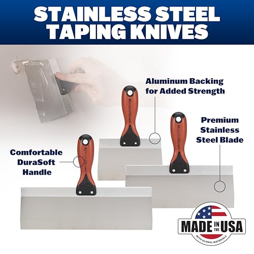 - COMPLETE KIT: Set of 5 professional drywall finishing spatulas with 6", 8", 10", 12" and 14" blades for all your drywall finishing needs., PREMIUM CONSTRUCTION: Tempered stainless steel blades with aluminum backing plates provide optimal flexibility for precise cuts while maintaining shape., ERGONOMIC DESIGN: DuraSoft handles ensure a comfortable grip and reduce fatigue during prolonged use while maintaining excellent control., VERSATILE APPLICATION: Perfect for applying and smoothing putty, finishing drywall joints, and general drywall repairs.