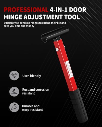 - 【Versatile 4-in-1 Hinge Tool】Tackle every hinge job with this 4-in-1 door hinge adjustment tool! Its four precise sizes (15mm, 20mm, 22mm, 26mm) make it the ultimate door hinge tool for cabinets & entry doors, eliminating the need for multiple wrenches, 【Comfortable Grip, Less Fatigue】The ergonomic, non-slip handle makes this hinge adjustment tool a joy to use. Get a secure grip for precise control and reduced hand strain, ensuring comfort during quick fixes or prolonged professional use, 【Quick Fix for Misaligned Doors】Easily fix sagging, sticking, or noisy doors! This effective hinge bender tool is your go-to door gap adjustment tool. It quickly restores alignment, eliminates friction, and ensures smooth, quiet door operation, 【Reliable & Built to Last】Crafted from hardened carbon steel with anti-rust coating, this heavy-duty hinge bender won't bend or break. This reliable door hinge wrench is built for long-lasting performance in any environment, 【Portable & Ready to Use】Lightweight and compact, this complete hinge tool set is ready for any job. It's the perfect on-the-go solution for pros and DIYers