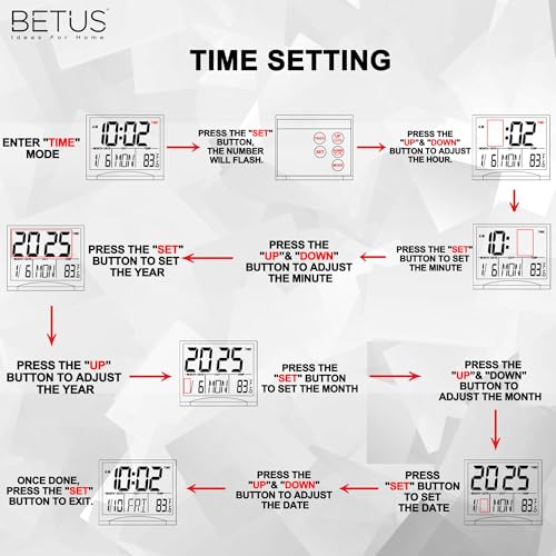 - Multiple features - A clock that satisfies all you need. Large font display and backlight make it bold and easy to read. Not only does it tell the date, time, and temperature, but also it has features with alarm clock and timer., Portable and elegant - A minimized size of 3" x 3.4" x 0.5", compact and lightweight for easily pack or toss into your purse. Collapsible with a stable stand, perfect size for a travel clock., Easy operated – Please note to update the "Year" before setting the correct day. (Press the "Set" button three times to get to the year). You can watch the video instruction on the detail page or read the instruction on the description part to easily set with more features. If you have trouble setting the clock, please do not hesitate to let us know!, Indispensable daily tool - Help you to get daily information quickly, then you can pick the clothes to wear today with no hurry. It takes no more than a few minutes to figure out the setup instructions., Betus warranty - We stand behind our products! All items sold by us come with a one-year warranty.