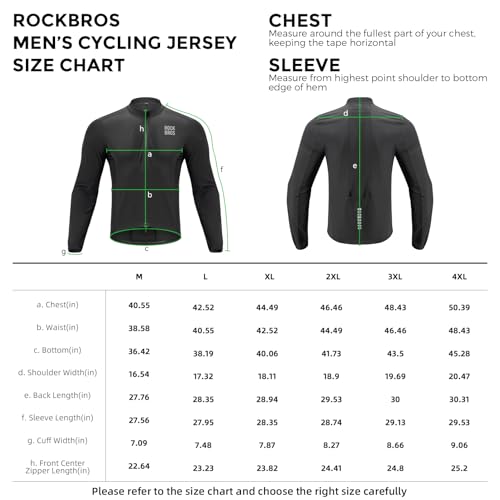 - BREATHABLE AND COOLING PERFORMANCE:Our men’s long-sleeve cycling jersey features a high-performance fabric blend: the main body is crafted from durable nylon, paired with large-area 3D woven mesh (100% polyester) for exceptional breathability. It keeps your body dry even during rides in 18-30 ℃ weather, while optimizing airflow to reduce sweat buildup—greatly boosting riding comfort and efficiency., LIGHTWEIGHT AND PACKABLE DESIGN:Our bike shirt is made of ultra-light nylon and polyester. It features double-way zippers for easy on/off, and this men’s windbreaker jacket can be packed into a compact pouch—taking up minimal space in your cycling gear or backpack. It’s perfect for riders who value portability during long rides or multi-activity trips., MULTI-SCENE VERSATILITY:This bike jersey takes a sleek, minimalist design that suits cycling, camping, and casual wear. Elastic cuffs, an anti-slip hem, and double zippers ensure a stable fit during intense rides. It looks stylish whether you’re on a road bike, at a campsite, or strolling in the city—one cycling jacket to meet all your active lifestyle needs., SAFETY-FOCUSED DETAILS:Reflective elements on the back and shoulders of our premium men’s cycling jacket significantly boost visibility in low-light conditions, such as dawn, dusk, and night rides. The back pocket with a secure closure stores your phone or keys; smooth double zippers won’t get stuck, and anti-rub zipper flaps protect your skin. This cycling jacket is engineered for safe, hassle-free rides., PRECISE SIZING AND FIT:To ensure the perfect fit, our men’s bike jacket comes with a detailed size chart that covers height (64.96-76.77 inches) and weight (132.2-220.46 lbs), along with chest, waist, and hem measurements. Designed for both comfort and practicality, this jacket features a convenient back pocket for storing small essentials like your phone or keys—note that there are no side pockets. Its slim-fit cut (not too tight or loose) flatters your body lines.