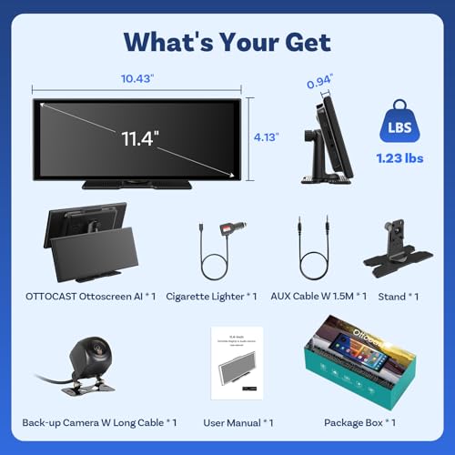 Ottocast Ottoscreen AI, 11.4 Inch Carplay Display Compatible with Netflix/YouTube, Carplay Android Car, Video Display with Rear View Camera 1920 x 720P Touch Screen 5G WLAN Bluetooth for iOS 8+