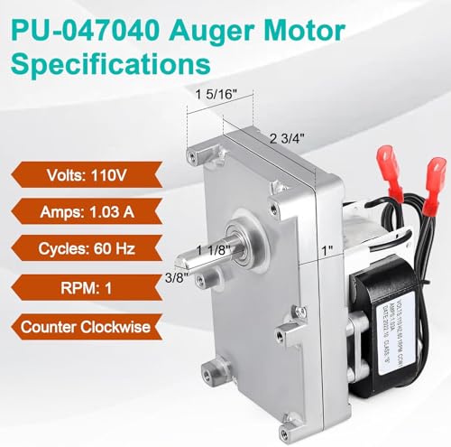 - PU-047040 Auger Motor Specifications: 110V, 1.03A, 60 Hz, 1RPM, Counter Clockwise, Wire Length: 20" with 1/4" Male and Female Terminal, Replacement Part Numbers: PU-047040, 44269, B4415UI., Widely Compatible: PU-047040 Auger Feed Motor Replacement for Englander Pellet Stove Models 10-CPM, 25-CAB80, 25-PAF, 25-PDV, 25-PDVC, 25-PDVE, 25-PDVP, 25-PFS, 25-PI, 55-SHP22E, 49-SHCPM, 49-TRCPM, 55-SHPCAB80, 55-TRPCAB80, 55-SHP22, 55-TRP22, 55-SHP10, 55-SHP10L, 55-TRP10, 25-PFSP, 55-SHP25, 55-TRP25, 55-SHP15, 55-TRP15, 55-SHP20, 55-TRP20., Easy to Install: Magnum Auger Motor PU-047040 easy to install, The bearing assembly and auger assembly can be replaced by reversing this process. Auger motor is made of stainless steel, durable material that can be applied for a long time, Pellet stove operation can be kept efficient by replacing the auger motor., Powerful Functionality: The auger motor's function is to manage the rate at which the pellets go through into the combustion compartment, which aids in maintaining the desired level of heat output and regulating temperature; PU-047040 Auger Motor fit your pellet stove, It is designed to provide reliable, efficient performance to ensure your heating system runs smoothly and effectively., Quiet Operation: PU-047040 Auger Motor is a durable sealed ball bearing motor, the quality of the replacement motor is equal to the original motor, safe and reliable to use, This upgraded motor has enough oil between the internal gears, so the gears rotate without making loud noise and rotate stably.