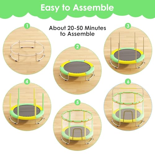 - 【Safety Upgraded】This 60" toddler trampoline features an upgraded ring legs design for added stability and safety. It comes with a 360° wrap-around, environmentally friendly three-layer thickened safety pad, a reinforced safety net, and upgraded foam for enhanced protection. Suitable for kids aged 1-8, this trampoline supports up to 440lbs, ensuring fun and secure jumping. Perfect for promoting active play and coordination while keeping children safe during every bounce!, 【3 Adjustable Height & Bearing 440 LBS】This toddler trampoline features an adjustable gymnastic bar with 3 height settings, allowing it to grow with your child and help enhance their physical fitness and balance. The bar is perfect for building strength and coordination, and it can be removed when your little one is ready to explore other activities. With a 440lbs weight limit, it accommodates children of all sizes, providing endless fun and opportunities for skill development., 【Easy Assembly & Free Accessories】This Toddler trampoline comes with a separate accessory package and an installation video for quick setup. It can accommodate up to 3 kids over 3 years old. The package includes fun accessories like double-sided darts, a swing, two rings, sandbags, ocean balls, a basketball hoop, and a basketball. Perfect for physical exercise and brain development, this versatile trampoline with a swing can be installed indoors, outdoors, or in your garden or courtyard., 【Anti-Abrasion Design】The jumping mat of this kids' trampoline is crafted from high-elastic waterproof Oxford cloth, ensuring excellent elasticity and durability even with long-term use. This material maintains its shape, providing consistent bounce and support. It is also easy to clean, making maintenance a breeze. Whether for indoor or outdoor use, this trampoline is designed to last, offering both long-lasting fun and reliability for your child’s active playtime., 【Perfect Gift Choice】With vibrant colors, our trampoline will captivate kids and keep them entertained for hours. It offers a safe, exciting space for jumping and playing, away from furniture, giving you peace of mind. Ideal for birthdays, holidays, or any occasion, this trampoline is the ultimate gift for energetic children. It encourages physical activity and creativity, making it a perfect addition to any home or play area.
