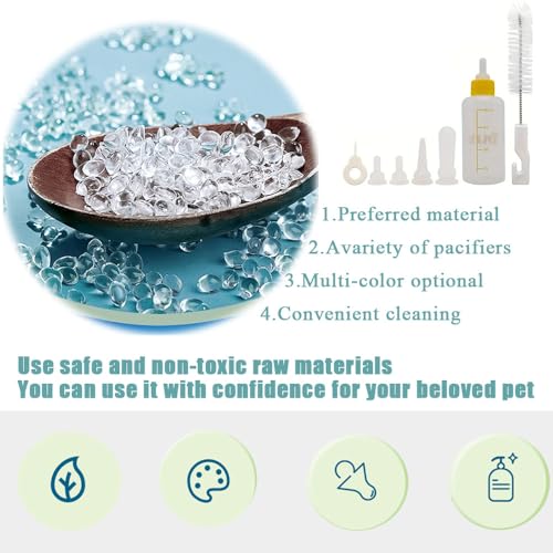 - Safe and Soft Pet Nursing Bottle Made of silicone nipples and plastic and gentle for newborn kittens,puppies,and small animals.The soft nipple mimics natural feeding,while the squeezable bottle ensures a comfortable milk feeding experience, Precise Feeding with Clear Scale The 60ml pet bottle features easy to read ml markings for accurate liquid measurement.Perfect for orphaned pets,it helps prevent overfeeding and ensures proper nutrition for baby cats,dogs,hamsters, and rabbits, Easy to Clean and Reusable Designed for hygienic pet care,the animal feeding bottle disassembles quickly for cleaning.Use the included cleaning brush and hole needle to maintain cleanliness.Rinse with warm water (avoid hot water) and air dry for repeated use, Complete Nursing Kit for Small Pets This pet nursing bottle set includes 1x 60ml bottle, 4x silicone nipples,1x cleaning brush,and 1x hole needle.Ideal for newborn pets,the extra nipples allow adjustable flow rates to prevent leakage during bottle feeding