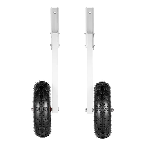 - High Capacity: This boat launching wheels kit is compatible with boats weighing up to 600 lbs/272.2 kg and up to 13 ft/4 m in length. Adding wheels to the transom not only makes it easier to move the boat but also helps maintain the boat's bottom coating., Foldable and Adjustable: The launch wheel arms feature 2 pairs of quick-release pins for easy disassembly. The arms rotate up and down to retract the wheels on the water, and the length is adjustable to fit different boats., Durable Rubber Tire: The inflatable boat wheels with a diameter of 12 inches(304.8 mm), feature a tread with clear patterns and rubber studs, enabling easy rolling over grass, mud, sand, and gravel paths., Durable Aluminum Alloy: The aluminum alloy boat wheel arms are built to withstand corrosion in freshwater environments, making them ideal for low-salinity areas such as lakes and rivers., Easy to Install: The transom wheels can be installed by one person. The transom panel should be ≤1.4 in thick. Prepare a drill, sealant, wrench, and grease, and mark the hole positions. Once the brackets are in place, assembly is quick.