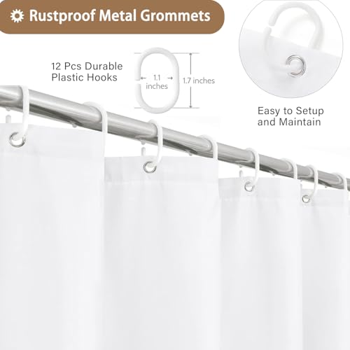 - Premium Hotel-Quality Fabric:Experience the luxurious feel and durability found in high-end hotels. Our the ACCLIFE shower liner is crafted from a heavyweight, soft yet sturdy polyester fabric that drapes beautifully and resists wrinkling, instantly upgrading your bathroom's aesthetic., Truly Machine Washable & Easy Care:Forget about replacing plastic liners! This reusable white fabric shower curtain liner is completely machine washable. Simply toss it in the wash with a little bleach or vinegar to keep it fresh, white,and soap scum, saving you money over time., Waterproof & Quick-Drying:Advanced polyester backing provides reliable,waterproof protection to keep your floor dry. The breathable fabric allows air to circulate, enabling it to dry significantly faster than standard vinyl liners, Complete Set with Plastic Hooks:Get everything you need in one box! The liner includes 12 durable hooks for immediate, hassle-free installation on any standard shower rod. The reinforced grommet holes ensure long-lasting strength and prevent tearing., Perfect Size & Eco-Friendly Choice:Designed to fit standard bathtubs and showers at 72 inches wide by 78 inches long. This reusable, washable liner is an eco-conscious alternative to disposable plastic liners, reducing plastic waste while providing superior performance and style.