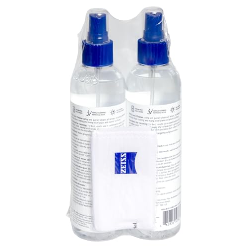 - Dependable: ZEISS lens cleaner and microfiber cleaning cloth work together to provide a streak-free finish suitable for everyday use., Safe: Use ZEISS lens cleaner spray or microfiber cloth on a variety of items including lenses with anti-reflective coatings, blue light blocking coatings, prescription, reading, sunglass, binoculars, or camera lenses., Effective: The gentle formulation of ZEISS lens cleaner is ammonia-free, toxic-free, and low VOC to protect and clean all lens types. The ZEISS microfiber cloth is resuable and washable. For best results machine wash occasionally and do not use fabric softener., Non-abrasive: Our ultra-soft eyeglass cleaning cloth and lens cleaner is non-abrasive and soft to be tough on imperfections, not lenses., Convenient: The small 8-ounce bottles are made for on-the-go use, perfect to keep in your car, backpack, purse, or wallet.