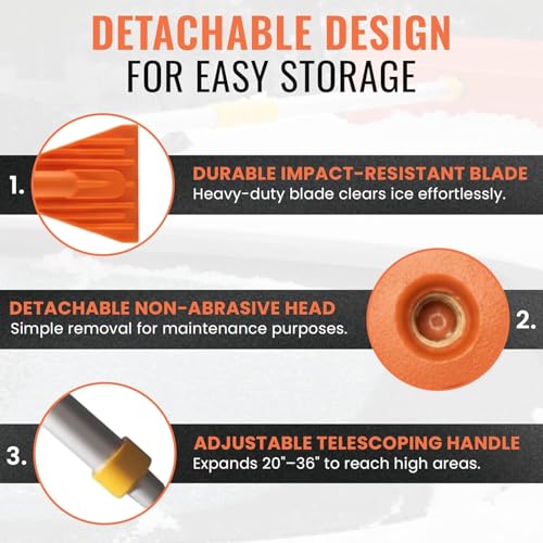 - ORIGINAL USA-MADE DESIGN: Proudly made in the USA, this snow rake delivers dependable performance and durability, making it ideal for winter car care, snow removal tools for cars, and SUV roof snow rakes., TELESCOPING ALUMINUM HANDLE: The adjustable aluminum handle extends from 20" to 36", offering excellent reach for clearing snow off SUVs, trucks, minivans, and vehicle roofs, making it ideal for shoppers looking for long reach snow brushes, extendable snow rakes, and telescoping ice scrapers for winter car care., GENTLE ON VEHICLE SURFACES: The 12" rake head and Sure Grip ice scraper remove snow and ice without scratching, making it a safe car snow brush and ice scraper for paint, windshields, and hoods., VERSATILE ICE REMOVAL: Includes a 9" Sure Grip ice chisel for tougher ice buildup, providing an all-in-one snow scraper and ice removal tool for winter driving conditions., CONVENIENT AND DURABLE: Built with long-lasting materials and a storage clip for easy hanging, this snow rake and snow scraper combo is ideal for drivers needing reliable car snow removal tools for daily winter use.