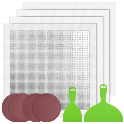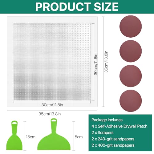 - 12-INCH LARGE PATCHES, CUT-TO-FIT VERSATILITY- Tackle any size repair with four oversized 12” x 12” wall patching stickers. Designed for large holes, yet easily trimmed with scissors to perfectly fit smaller cracks, odd shapes, or custom sizes, eliminating waste and providing ultimate flexibility., COMPLETE ALL-IN-ONE REPAIR KIT- Get a professional-grade repair in one box. Includes 4 self-adhesive drywall repair patches, 2 scrapers, and sandpaper (240-grit for shaping, 400-grit for finishing), equipping you with every tool needed for a smooth, paint-ready result., HEAVY DUTY ALUMINUM & FIBERGLASS CONSTRUCTION- Features a unique hybrid design: a rigid aluminum frame that prevents sagging in large holes, combined with a self-adhesive fiberglass mesh that bonds permanently to the wall for a durable, long-lasting repair., QUICK & EASY SELF-ADHESIVE APPLICATION- Achieve a hassle-free fix. The strong adhesive backing sticks securely on contact to clean, dry surfaces. Simply peel, position, and press—it holds firmly in place while you apply joint compound with the included knife., PROFESSIONAL RESULTS ON WALLS & CEILINGS- Perfect for a wide range of surfaces in kitchens, bathrooms, offices, or basements. Follow the straightforward steps (sand, stick, spread, sand) to seamlessly repair drywall and ceiling damage, restoring a flawless surface.