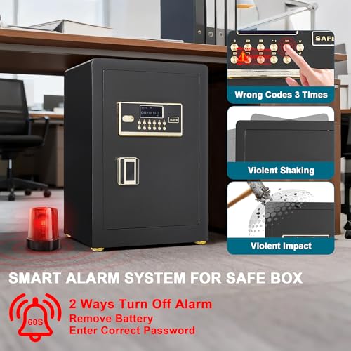 - FUTURE TECH, ALWAYS ACCESSIBLE: Embracing advanced technology, the EMASME safe box boasts a backlit LCD touchscreen keypad that combines convenience with futuristic appeal. Simply enter your password, and the safe unlocks in an instant. The backlight ensures visibility even in low-light conditions, and the emergency battery box ensures continuous access during power outages. Experience the ease and accessibility of modern security solutions., DUAL ALARM MASTERY: With our EMASME Home Safe. Crafted with cutting-edge one-piece bending ,equipped with a dual alarm system, Three-incorrect entries or shake the cabinet body after press 9 number can activate the alarm system, the safe immediately triggers a loud 70-decibel alarm, deterring intruders,effectively keep your secret away from anybody, REMOVABLE AND ADJUSTABLE SHELF: This safe box is not just about security; it also provides ample space and offer you numbers DIY organization options. use removable and adjustable shelf, you can customize the interior layout according to your needs., MILLIMETER LEVEL LASER CUTTING TECHNOLOGY: The EMASME Safe Box is the ultimate solution for keeping your valuables secure and giving you complete peace of mind. With millimeter Level Laser Cutting Technology, 60mm anti-drill door, 1mm anti-pry design, and 28mm anti-theft bolts, our sentry safe offers unparalleled security to protect your most sensitive items from unauthorized access., THREE UNLOCKING WAYS : When you choose the EMASME safes for home, you receive more than just a product. The comprehensive package includes the safe box itself, two keys, six expansion screws for rock-solid installation, an emergency battery box, four non-slip foot mats for stability, and a user manual to guide you through the setup process. We stand behind our product with round-the-clock customer service and a 90-day unconditional return policy, ensuring your satisfaction and peace of mind.