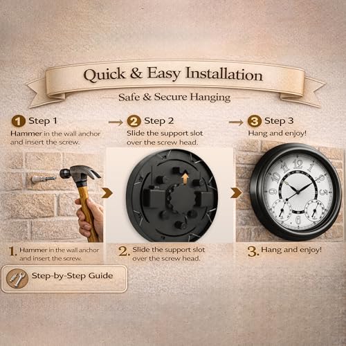 - 【Outdoor Clock with AI Smart LED Illumination Sensor】Pytha Sight 15 inches outdoor clocks waterproof features a built-in smart light sensor that automatically turns the LED backlight on at dusk and off at dawn. Choose between Off, Light I, and Light II to match different nighttime visibility needs., 【Waterproof & UV-Resistant Metal Outdoor Clock】Designed for real outdoor use, this large outdoor wall clock features a sealed waterproof structure and a durable metal frame with UV-resistant coating, helping protect against rain, sun exposure, and changing outdoor conditions., 【Large 15 Inch Easy-to-Read Outdoor Wall Clock】With an large dial, bold numerals, and clear hands, this outdoor clocks for patio waterproof is easy to read from a distance, making it ideal for patios, gardens, porches, and backyards., 【Built-In Thermometer & Hygrometer Display】Pytha Sight big outdoor clock for pool area includes integrated temperature and humidity gauges that automatically illuminate in low-light conditions. Measures temperatures from -40°F to 140°F and humidity from 1% to 99% RH for added outdoor awareness., 【Unique Design Elements Details for Indoor & Outdoor Use】The design concept of three-dimensional lines, with interwoven lines, enables the light to create a three-dimensional effect that brings a visual impact. This beautifully crafted outdoor clocks effortlessly combines timeless style with modern functionality, making it as a standout addition to any indoor or outdoor space.