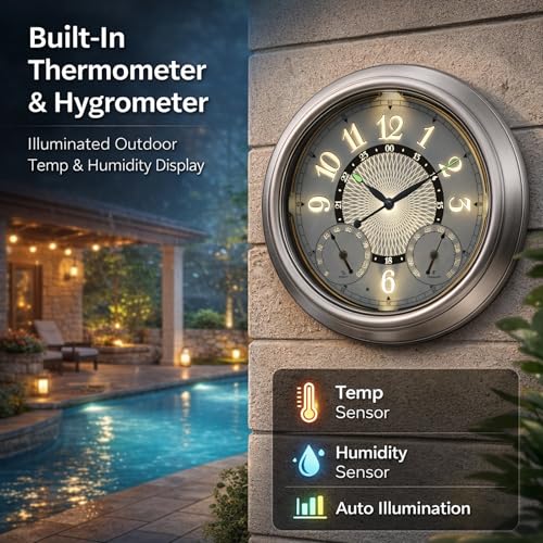 【Outdoor Clock with AI Smart LED Illumination Sensor】Pytha Sight 15 inches outdoor clocks waterproof features a built-in smart light sensor that automatically turns the LED backlight on at dusk and off at dawn. Choose between Off, Light I, and Light II to match different nighttime visibility needs., 【Waterproof & UV-Resistant Metal Outdoor Clock】Designed for real outdoor use, this large outdoor wall clock features a sealed waterproof structure and a durable metal frame with UV-resistant coating, helping protect against rain, sun exposure, and changing outdoor conditions., 【Large 15 Inch Easy-to-Read Outdoor Wall Clock】With an large dial, bold numerals, and clear hands, this outdoor clocks for patio waterproof is easy to read from a distance, making it ideal for patios, gardens, porches, and backyards., 【Built-In Thermometer & Hygrometer Display】Pytha Sight big outdoor clock for pool area includes integrated temperature and humidity gauges that automatically illuminate in low-light conditions. Measures temperatures from -40°F to 140°F and humidity from 1% to 99% RH for added outdoor awareness., 【Unique Design Elements Details for Indoor & Outdoor Use】The design concept of three-dimensional lines, with interwoven lines, enables the light to create a three-dimensional effect that brings a visual impact. This beautifully crafted outdoor clocks effortlessly combines timeless style with modern functionality, making it as a standout addition to any indoor or outdoor space.