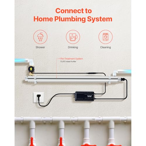 - Comprehensive Set of Accessories: Includes 1 stainless steel main body tube, 2 light tubes (1 for use and 1 spare), 1 quartz glass sleeve, 1 power ballast, 4 mounting brackets (2 for use and 2 spares), 2 sealing rings (1 for use and 1 spare), 4 quick connectors, and 1 roll of tape. If any components are missing or arrive damaged, please reach out to us for a free replacement., Effortless Setup: This water purification system comes with mounting clamps for straightforward DIY installation. A detailed user manual and installation instructions are included, ensuring a quick and hassle-free setup process for first-time use. Horizontal mounting is advised for optimal performance., Safe and Dependable Construction: The pipe body undergoes ultrasonic high-temperature cleaning to eliminate impurities and prevent secondary contamination. It features a UV system fault alarm for convenient issue detection. A sturdy quartz sleeve offers reliable protection for the UV lamp, while the precise sealing and welding processes help prevent water leakage., Premium Water Filter with 12 GPM Flow Rate: Designed with a 56W power capacity and 1/4" NPT internal thread connections for inlet and outlet. Effectively removes chlorine, chemicals, and other impurities, ensuring a safer and eco-friendly water supply. Maintains the natural taste, color, odor, and pH balance of the water., Effective UV Water Treatment: The durable stainless steel chamber improves ultraviolet light reflection, ensuring a sterilization efficiency of up to 99.99%. Equipped with a UV lamp boasting a lifespan of 8,000 hours and a reliable electronic ballast, it delivers clean and safe water for your home consistently.