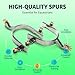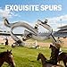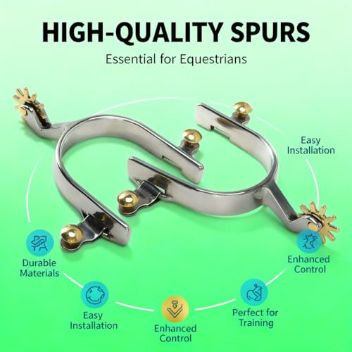 - [Durable Stainless Steel]: Crafted from strong stainless steel, these spurs resist and wear, ensuring long-lasting use for horse training and competition., [Enhanced Riding Control]: Designed to improve leg sensitivity and horse responsiveness, these spurs help you maintain excellent control during riding sessions., [Classic Cowboy Style]: Features exquisite western cowboy design ideal for pairing with spur straps men or cowboy accessories to enhance your riding outfit., [Easy Installation]: Compact and lightweight spurs fit comfortably on boots with a practical U-shaped opening for quick and convenient use., [Versatile Equestrian Use]: Suitable for horse training, rodeo, dressage, ranch work, and other roughstock activities, compatible with spurs for boots and roping accessories.