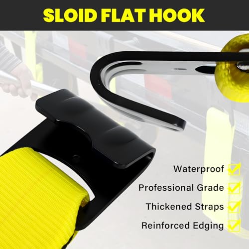- American Strength: Our 4 in x 30 ft truck straps are crafted from industrial high-strength polyester, that is engineered for heavy-duty performance. With an impressive 16,200 lbs breaking strength and a reliable 5,400 lbs working load limit, these flatbed winch straps work well when securing heavy loads during flatbed hauling, trailer transport, or heavy truck cargo fastening, Durable Premium Construction: Engineered for oversized load projects, our heavy-duty cargo straps feature double the length and width of standard heavy duty flatbed straps. Made of durable polyester with reinforced black stitching on both edges, these 30ft flatbed tie-down straps resist tearing. The powder-coated steel flat hook boasts excellent water and abrasion resistance for long-lasting use, Compatibility & Effortless Loading: Our heavy-duty winch straps boasting compatibility with flatbed truck winch systems. Flatbed Straps roll out smoothly and tighten quickly with your winch, cutting down precious time spent securing cargo. The metal piece protects the strap from the sharp edges of the hook when feeding through. With strong stitching and durable hooks, these tie-down straps lock into place easily, Heavy-Duty Steel Flat Hooks: The black steel flat hooks features a special anti-corrosion coating, designed to be weatherproof against rain and sunshine. Thickened flat hooks on our 4 inch tie down straps fit with various anchor points on vehicles and trailers, delivering a tight and reliable hold to keep cargo secure during transit, Versatile Universal Use: These straps for flatbed lock cargo firmly in place to prevent shifting and sliding, delivering stable load security for both short hauls and long-distance transportation.Compatible with most transport vehicles, this winch straps set enables easy installation and hassle-free operation.Ideal for motorcycle hauling, daily cargo runs, and off-road adventure trips.