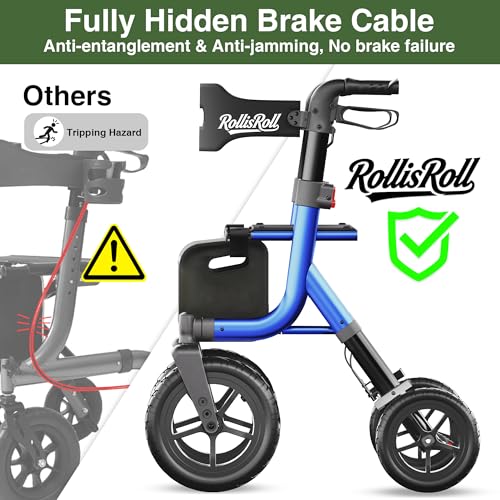 - 【12-inch Large Rubber Wheels】The walker features oversized rubber wheels (12-inch front wheels, 10-inch rear wheels). The 360° swivel design ensures smooth rolling, while anti-slip and shock-absorbing properties make it suitable for outdoor environments like uneven terrain, gravel, concrete, and grass., 【Upgraded Safety with Built-in Cable Design】Features an integrated brake cable to prevent tangling and tripping hazards while maintaining a sleek, compact appearance. The walker supports speed control and locking functions, with an ergonomic hand brake for easy operation that enables smoother deceleration and braking., 【Durable and Foldable】The RollisRoll Senior Walker features a reinforced aluminum alloy frame. Weighing just 19.2 pounds, this four-wheel walker supports up to 300 pounds. Its three-second quick-fold design ensures easy portability and storage., 【Ultimate Comfort】Features a wide, breathable backrest that perfectly relieves back pressure, paired with an extra-wide soft seat that significantly enhances comfort and safety for elderly users. The ergonomic handle design ensures optimal grip, adding an extra layer of security during use. With a width of 23.8 inches, the walker easily navigates through narrow doorways or elevators without obstruction., 【Height-Adjustable Handrails】This walker with seat features height-adjustable handrails with 5 settings (32.6 inches to 37 inches), perfectly adapting to your stature without bending over. Suitable for users between 5 feet and 6.9 feet tall., 【Additional Features】Equipped with a removable cup holder, large-capacity storage bag, and walking stick holder for convenient storage of personal items or essentials; reflective strips significantly enhance visibility during nighttime use., 【After Sales Support】: 18 month warranty, complete with a detailed user manual and installation video, enabling tool free setup in just 5 minutes. For any inquiries, we'll respond within 24 hours. Shop with confidence at RollisRoll.
