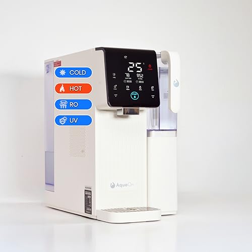 - PURE WATER IN SECONDS — NO PLUMBING, NO DRILLING, NO TECHNICIAN. AquaOn AQ100 is a plug-and-play countertop RO system — fill the 5.5L tank and drink hospital-grade purified water instantly. Perfect for renters, apartments, offices & RVs. No installation, no hassle. Just pure water, anywhere., REMOVES PFAS, LEAD, FLUORIDE & 1000+ CONTAMINANTS — NSF/ANSI 58 CERTIFIED. The AQ100's 6-stage RO + UV + Alkaline filtration eliminates up to 95% of TDS, PFAS, PFOA, PFOS, lead, arsenic, fluoride, chlorine, heavy metals, nitrates & chromium VI — verified by NSF/ANSI 58 & 372 and SGS third-party testing. BPA-free., INSTANT HOT & COLD WATER — REPLACES YOUR KETTLE, WATER COOLER & FILTER IN ONE. Choose from 6 precise temperatures — 5°C ice-cold to 95°C near-boiling for tea, coffee, noodles or baby formula. No waiting, no kettle, no extra appliances. One compact Keurig-sized unit that fits any countertop — saving you space, money & time., SMART OLED DISPLAY — SEE YOUR WATER QUALITY IN REAL TIME. The OLED touchscreen shows live input & output TDS levels, filter lifespan for RO (12-month) and PCA (24-month) filters, dispensing volume & temperature. Includes child lock for safe hot water dispensing, night mode for low-light use & smart auto-alerts for filter replacement., CERTIFIED SAFE & BACKED BY WARRANTY — TRUSTED BY CANADIAN FAMILIES. The AQ100 is NSF/ANSI 58 & 372 certified, CE & RoHS compliant, SGS third-party tested — meeting the highest global safety standards. 2.5:1 pure-to-drain ratio. Compact (42 x 23 x 41 cm), easy user-replaceable filters, 12-month warranty. Canadian innovation, built for Canadian water.