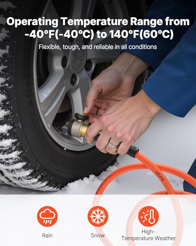 - 3/8 in x 50 ft Hose: Designed for effortless operation, this air hose for compressor combines a lightweight build with enhanced flexibility, giving you better control than regular air compressor hoses, Durable Material: Built with a 3-layer construction, this air hose features a rubber inner layer for smooth airflow, a polyester braided middle layer for added strength, and a rubber outer layer that enhances flexibility and wear resistance. Withstand 300 PSI working and 900 PSI burst pressure, All-Season Performance: Engineered for all-weather use, our pneumatic hose stays flexible and reliable from -40 to 140°F/-40 to 60°C. Even in cold workshops or winter outdoors, it won’t harden, kink, or crack, ensuring consistent performance, Simple Operation: Equipped with 1/4-inch MNPT brass fittings, our air compressor line easily attaches to air compressors or pneumatic tools, allowing quick setup and effortless operation, Bend Guard: With bend protection sleeves on both ends, the pneumatic hose withstands over-bending at the root. This design reduces wear, avoids damage such as cracking, leaking, or joint failure, and increases the overall service life