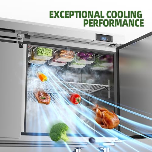 - Preservation Setup: Our commercial refrigerator sandwich salad prep table features a superb compressor, R290 refrigerant enabling fast, even cooling. Polyurethane foam-lined cabinets lock in temperature to keep them steady, while tight door gaskets prevent cold air loss. Automatic defrost system maintains refrigeration efficiency. These robust components keeping your food safely preserved., Customizable Organization Options: This 2 door sandwich salad prep table's cold topping area comes with a full set of adjustable stainless steel clip-on dividers and 12 food pans, let you mix and match for a custom layout, craft your unique workflow. Refrigeration compartment boasting a 13.5 cuft capacity accommodates all your oganize backup ingredients., Smart Design: Our commercial refrigerator smart design maximizes kitchen workflow efficiency. The LCD digital temp control panel offers precise regulation, clearly shows current temps, and lets you quick adjust between 33-41°F(with possible variance of up to 8°F from set point). Integrated door handles offer a comfortable, slip-resistant grip even with wet hands. Doors stay open when beyond 90 degrees and auto-close when below, adding convenience to your prep process., Commercial Grade Durability: This sandwich salad prep table crafted from robust stainless steel, which is tough enough to stand up to heavy equipment, sharp tools, and frequent cleaning. It comes with a removable stainless steel guard and 2 adjustable wire shelves, leaving no-hard-to clean hygiene blind spots. 4 casters (2 with locks) let you lag it anywhere effortlessly., Multiple : The 1/2 inch thick cutting board holds NSF certification, ensuring food safety. With DOE and ETL certifications, plus an integrated compact design, it’s and easier to use. Backed by Coolake’s quality, it also includes 5 years of compressor and 3 years of parts. Ideal for your food, everyday use and perfectly suited for cafeterias and delis.