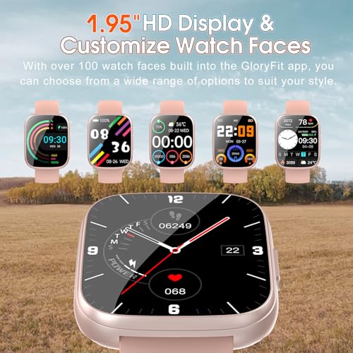 - Stay Connected and Messaged: The smartwatch uses the advanced Bluetooth 5.4 chip, providing fast and stable connections to your phone. With its built-in microphone and Hi-Fi speaker, you can make and receive clear calls directly from the watch. It also supports notifications from popular apps like Facebook, WhatsApp, Instagram, and Twitter. All notifications are displayed on your wrist and accompanied by vibration alerts, ensuring you never miss important calls or messages., 1.95-inch Touch Screen and Personalized Watch Face: Smart watches for women men is equipped with a new generation 1.95-inch high-definition touch screen, which greatly improves color quality and touch response speed, allowing you to easily browse its various functions. There are up to 200+ watch faces for you to choose from in the "Gloryfit" app, and you can even customize the watch face wallpaper with your favorite photos., 110+ Sports Modes and IP68: The fitness tracker provides up to 110+ sports modes, covering running, cycling, fitness and other activities to meet the preferences of different users. Activity trackers bracelets meet the waterproof requirements for most sports enthusiasts' daily activities, such as washing hands or exercising in the rain, meeting daily needs (note: do not use it in water, such as sauna, long-term soaking in water, which will affect the waterproof life)., Monitor Your Health 24/7: T80 mens womens watch uses advanced sensing chips and photoelectric sensors for precise monitoring. The smart watch can monitor heart rate in real time 24 hours a day. Always pay attention to your physical health. The men's smart watch automatically monitors your sleep status (deep sleep, light sleep, awakening) and provides comprehensive sleep quality analysis to help you better understand sleep changes., Long Battery Life and Versatile Assistant: Equipped with a large capacity battery, this activity trackers can last up to 5-7 days on a single charge, has a standby time of up to 30 days, and can be fully charged in just 2 hours. This smart watch includes more practical functions, such as sleep monitor, call notifications, SMS and app messages, music and camera control, brightness adjustment, weather display, sedentary remind.