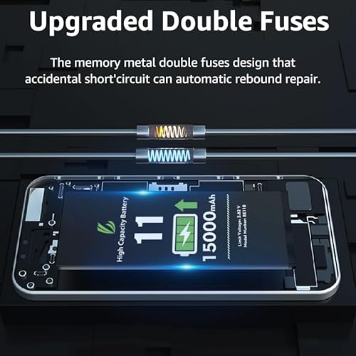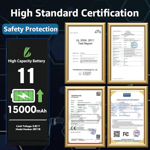 - [Compatible Model] - This battery is only compatible with iPhone 11(NOT FOR IPHONE 11 PRO and PRO MAX), A2111, A2223, A2221. Please confirm your iPhone model before purchase. (Check your iPhone model at the following steps: Settings--General--About--Model Name), [High Capacity] - 15000 mAh high capacity, greater than what the original iPhone 11 battery has, which means you don't have to charge your iPhone as frequently as you used to be., [Long Lasting] - Brand new 0 cycle battery, designed and tested to last over 1000 cycles. Charging speed and the power conversion rate increase by 90% with new technology., [Protection for Safety] - Built-in new upgrade smart tech IC chip to prevent over-charging, over-heating, Short-Circuiting, etc for safety., [Package Includes] - Brand new battery replacement for iPhone 11, all required tool kits to replace the battery.Please watch the video on youtube before install the battery.
