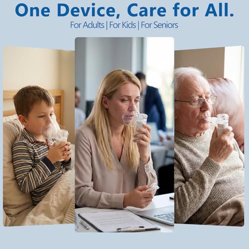 - 【Medical-Grade Performance for Effective & Comfortable Treatment】: This handheld nebulizer meets stringent medical-grade standards, producing ultra-fine, consistent mist particles that ensure optimal medication delivery directly to the lungs. Its advanced micro-mesh technology provides faster, more effective relief with greater comfort for both adults and children, making every treatment session count., 【Smart Digital Display with 3 Adjustable Mist Settings for Personalized Care】: Stay in complete control with the intuitive digital screen, displaying real-time battery life and session timer. Choose from three precise mist intensity levels—gentle for children, medium for everyday use, and strong for deeper relief—to perfectly match each user’s needs and ensure a comfortable, customized treatment experience., 【Ultra-Quiet Operation & Intelligent Self-Cleaning for Hassle-Free Use】: Engineered with a silent chip operating below 30dB, it’s quiet enough for nighttime treatments without disturbing sleep. The innovative self-cleaning function (activated with a simple button hold) automatically clears residue in minutes, maintaining peak performance, preventing clogging, and saving you valuable time on maintenance., 【USB-C Rechargeable & Truly Portable for Relief Anywhere, Anytime】: Experience ultimate freedom. Its compact, lightweight design fits easily in a bag or pocket. Powered by a long-lasting USB-C rechargeable battery, it provides multiple treatments on a single charge. Ideal for use at home, the office, or while traveling, ensuring your respiratory therapy is never interrupted., 【Complete Family Kit for Immediate Use & Dedicated Support】: Everything you need is included: the nebulizer, a dedicated adult mask, a softer pediatric mask for children, a universal mouthpiece, a Type-C charging cable, and a convenient travel pouch. Backed by our responsive customer service, you can start your effective and convenient respiratory care journey with complete confidence right out of the box.
