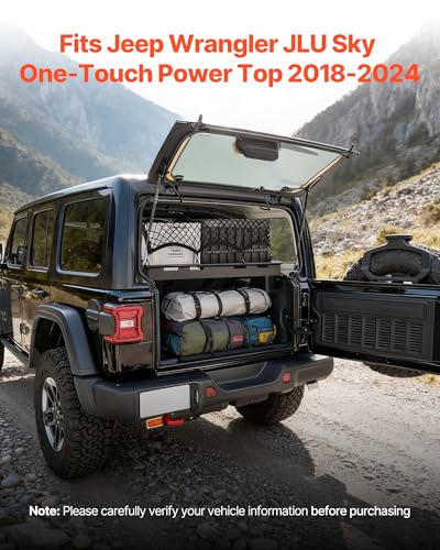 - Vehicle-Specific Fit: This rear trunk cargo rack is designed for the Jeep Wrangler JLU Sky One-Touch Power Top 2018-2024. Before purchase, please carefully verify your vehicle information to ensure proper fit, Sturdy & Durable: Our trunk interior luggage basket is made from premium, thickened carbon steel with a scratch-resistant powder-coated finish. It supports up to 300 lbs, providing long-lasting strength without bending or breaking for heavy-duty use, Layered Space Design: This rear trunk cargo rack basket tray divides your trunk into two separate spaces, easily handling luggage, camping gear, and fuel supplies. It ensures items are organized and accessible, enabling a clean and neat storage space, Shockproof and Noise-Reducing: Our interior storage luggage carrier features EVA foam strips that snugly fit on the rack, reducing vibration and noise during travel. Designed for space-saving, it provides quiet performance and efficient vehicle storage, Secure & Stable: Made with lightweight, durable polypropylene elastic netting, this luggage storage carrier tray resists impact and stretching. It fixes cargo firmly in place during bumps or everyday use, reducing shifting or falling for reliable storage