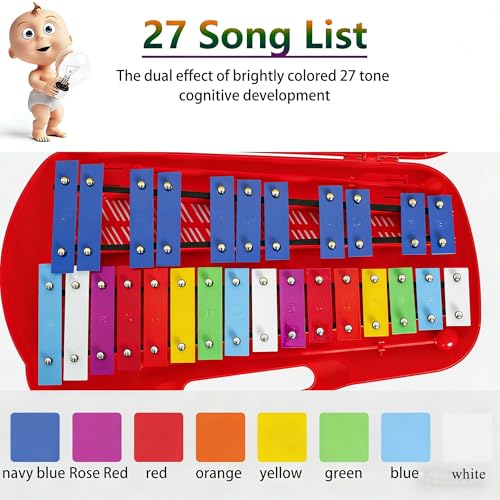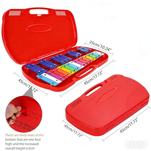 - đ”ăPremium MaterialăOur xylophones are made of high quality material. The colorful 25 notes are made from aluminium, which are lightweight but firm. The hard case and malletss are made of ABS plastic, which are all environmentally friendly and tasteless., đ”ăPrecise TuningăThe kids xylophone has 25 notes, 15 colorful notes with 2 full octaves, G to G clear, bright and precise tone providing wide range of musical sound, the piano-like notes can also help children to have better understand of keyboard instruments., đ”ăChildren-friendly DesignăThe rainbow-color metal keys of 25 notes glockenspiel can better help kids to distinguish the tones according to the color, stimulate childrenâs visual development. The easy-hold mallets allow kids use the xylophone simply and improve their hand control ability., đ”ăXylophone for BeginnersăThe piano-like notes help children have better understanding of the keyboard instruments. Suitable for music enlightenment, also as school learning and entertainment, đ”ăEasy to CarryăPackage includes a portable red case for travel and storage. and a smooth handle is easy to carry. The xylophone with 2pcs Child-Safe mallets, which are specially designed easy-to-hold mallets.