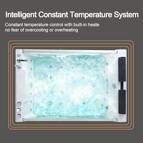 - STUNNING DUAL-GLASS DESIGN: Transparent front and back panels offer a luxurious, art-inspired look that enhances any modern bathroom., FULL HYDROTHERAPY MASSAGE: 16 water jets powered by a UL 1.2P motor deliver targeted relaxation and muscle relief., BUBBLE AIR SYSTEM WITH LIGHTS: 16 LED air jets create a soothing, sparkling soak for a spa-quality bathing experience., THERMOSTATIC HEATER & BLUETOOTH: Maintain perfect water temperature while enjoying music through the built-in Bluetooth system., MODERN FREESTANDING STYLE: Four finished side skirts and flexible left/right drain placement for easy installation and visual harmony.