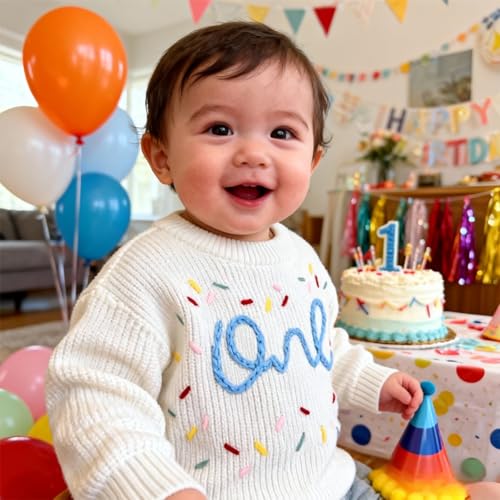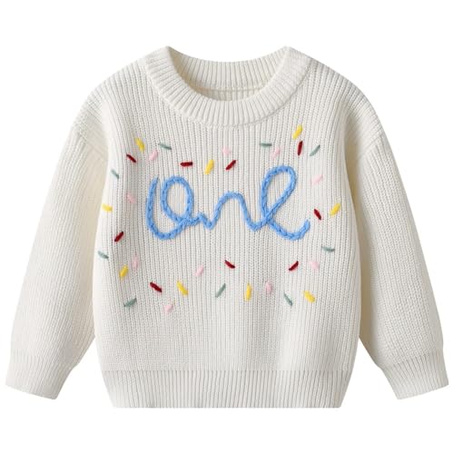 Koijhnb Toddler Baby Girl 1st Birthday Knit Sweater Infant Long Sleeve Embroidery Pullover Warm Fall Winter Smash Cake Outfit(White One,1-2T)