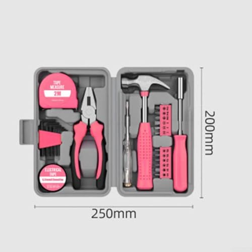 - 24PC TOOL SET: This multifunctional tool kit includes everything you need for various home repairs and projects, featuring a steel measuring tape, hex wrenches, wire cutters, and more, AND RELIABLE TOOLS: Each tool is made from robust materials, strength and longevity for all your DIY tasks, from electrical jobs to furniture repairs, ERGONOMIC DESIGN FOR COMFORT: The stylish pink handles not only add visual appeal but also provide a comfortable grip, reducing fatigue during extended use for enjoyable repair experiences, COMPACT AND PORTABLE: With dimensions of 200x125x45mm and a lightweight design at just 775g, this tool kit is For easy to store and transport, making it an essential companion for any homeowner, SIZING REMINDER: Please check your own sizing chart instead of 's size chart to the for your needs