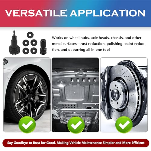 - Professional Rust Eraser: Rust on wheel hub axles severely impedes tire disassembly, posing risks to vehicle maintenance and emergency tire changes. This stud cleaner features rust cleaning capabilities to help you maintain wheel hubs regularly, assure smooth tire disassembly, and enhance driving safety, Replaceable Grinding Head: Features a hook-and-loop fastener design on the back for effortless head replacement. Provides secure adhesion and supports multiple replacements. Delivers uniform, fine grinding results to quickly reduce rust, significantly extending product lifespan, Universal Adapter: The wheel hub cleaning tool kit includes a 1/2-inch drive quick-release wrench adapter. Featuring a dual-purpose design, it is compatible with most electric wrenches and ratchet wrenches on the market, and fits various hex shank sockets and drill bits, Versatile Application: The hub cleaning kit is suitable for automotive hubs, chassis, axle heads, and mechanical surfaces, supporting multiple tasks including paint reduction, rust reduction, grinding, polishing, cleaning, and deburring, meeting diverse needs, Durable Construction: The brake hub cleaning kit features a high-hardness metal handle that withstands heavy pressure, making connections secure and resistant to breakage. The housing is crafted from impact-resistant plastic with excellent heat dissipation properties