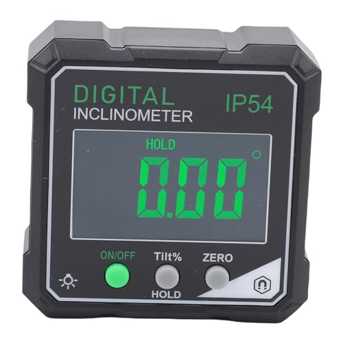 - [HIGH MEASUREMENT] - Accurately measure angles with a range of 4x90°, with an accuracy of ±0.2° and a resolution of 0.05°. Ideal for carpentry and construction projects., [MULTIFUNCTIONAL DISPLAY] - Easily switch between absolute or relative angles with the push of a button. The backlit LCD screen ensures clear visibility in all lighting conditions., [STRONG MAGNETIC BASE] - Securely attach the inclinometer to ferromagnetic surfaces such as pipes and saw blades for hands- operation. for table and chute saws., [DURABLE AND WEATHER RESISTANT] - Meets IP54 standards for dust and water , making it suitable for various environments and workplaces., [EASY TO USE] - Comes with a user manual and for effortless setup and operation. Battery operated for added convenience (batteries not included).